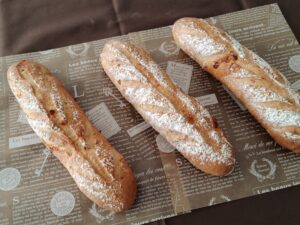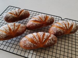 リュスティックはフランスパンの一種で「素朴」という意味のパンです。加水量多めでべたつきがあり成形が難しいため、生地をカットしたそのままで二次発酵、そして焼成します。長時間かけて作るのが本来ですが、教室では普段のパン作り同様に手軽に作れるよう工夫しました。クラストパリッとクラムはもっちりしっとりに仕上がってます。夏らしく枝豆とチーズを混ぜ込み塩味のバランスもバッチリです‼