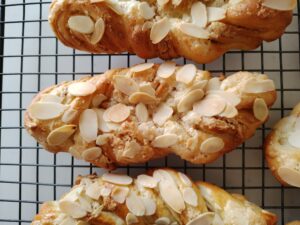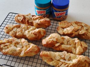 ピーナッツバターをデニッシュ風に折り込み、手綱ツイスト状に成形します。表面にはたっぷりのスライスアーモンドで香ばしく、仕上げにはココアパウダー入りのアイシングで見た目もお味も満足間違い無しです‼